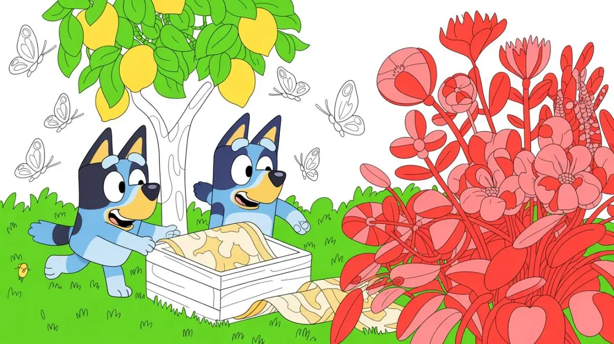 Al fondo, junto al limonero, encontraron un rincón que solía pasar desapercibido. Allí, la hierba crecía más alta y había un pequeño círculo de tierra húmeda que parecía haber sido removida hacía poco. Bluey se acercó, olfateó un poco, y notó que algo asomaba bajo la tierra. Con cuidado, comenzó a escarbar con sus patas delanteras. Bingo, con sus ojos muy abiertos, observaba como si esperara que de allí saliera un tesoro escondido.