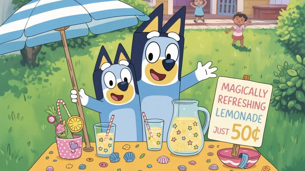 El jardín delantero se transformó en un pequeño mercado de verano. Bajo la sombrilla azul del abuelo, colocaron su mesa, decoraron el mantel con conchas recogidas en la última visita a la playa, y dibujaron un gran cartel que decía: «Limonada Mágicamente Refrescante – ¡Solo 50 céntimos!». Aunque no era mágica de verdad, Bluey creía que si uno imaginaba con fuerza, hasta el agua podía tener poderes especiales.