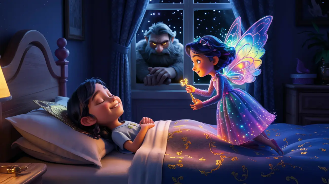 Sin perder tiempo, el hada voló hasta la parte alta de la habitación. La sombra se extendió como humo, persiguiéndola. La magia en el diente era fuerte, pero necesitaba un poco más de tiempo. Pensó rápidamente y, con un giro en el aire, lanzó el diente hacia el cielo nocturno. La energía del diente especial brilló con intensidad y creó un vórtice de luz. Del interior del vórtice, surgió la Llave Secreta, flotando suavemente hasta la palma del hada.
