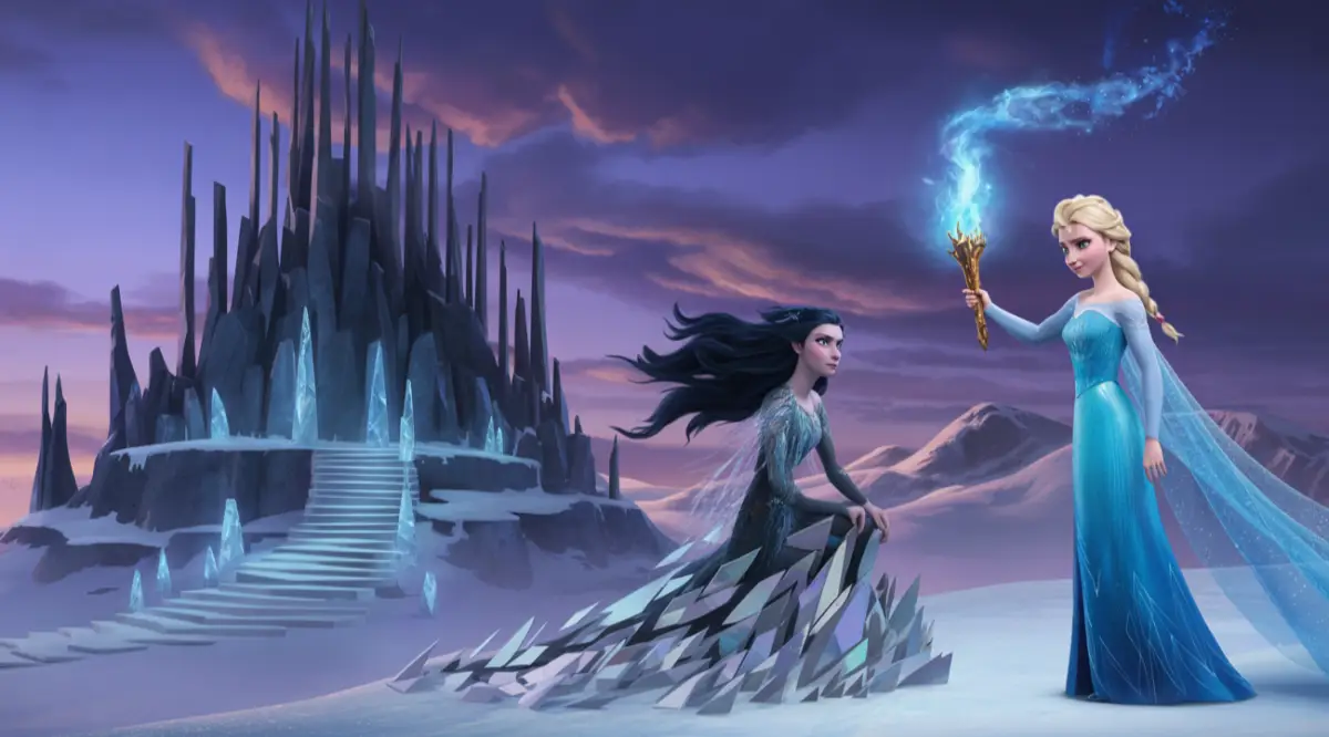 Al llegar a la montaña de Maeltha, la encontró transformada: no era una prisión, sino una fortaleza de hielo negro, con columnas que flotaban y escaleras que giraban como relojes. Allí, la Reina de Sombras esperaba, sentada en un trono hecho de fragmentos del espejo.