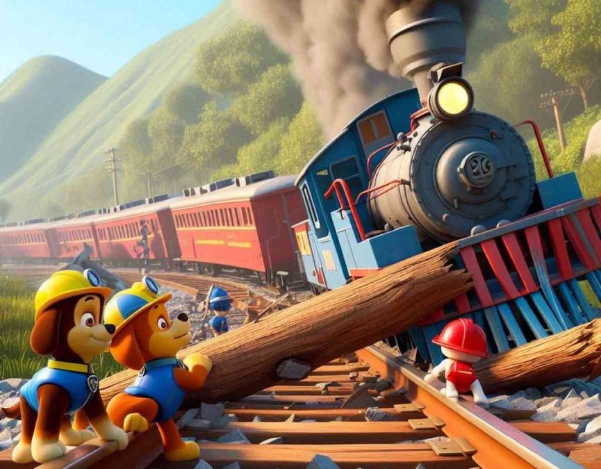 En un rincón del bosque, un gran árbol había caído sobre las vías del tren, bloqueándolas por completo. El tren que traía suministros para la ciudad estaba a punto de llegar, y si no se retiraba el árbol, el tren podría descarrilar. Sin perder tiempo, Ryder llamó a Chase, Marshall, Rubble, y Rocky, cada uno con una tarea específica.